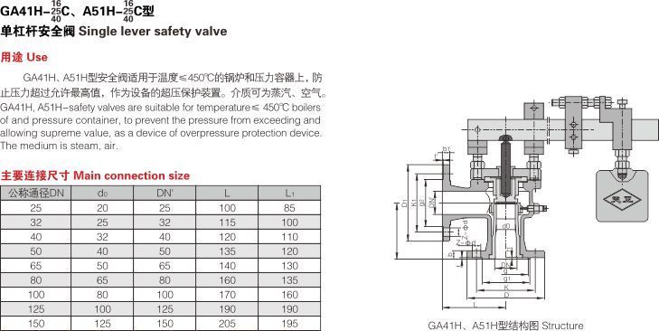 GA41H、A51H型安全閥適用于溫度≤450°C的鍋爐和壓力容器上,防止壓力超過允許z高值,作為設(shè)備的超壓保護(hù)裝置。介質(zhì)可為蒸汽、空氣。